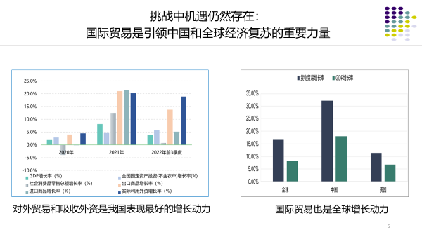 挑战中机遇仍然存在。虽然我们在点上看到了很多的问题,但是从面上来看,国际贸易还是引领中国和全球经济复苏的重要力量。最近三年的数据看下来,进出口和利用外资,特别是出口和利用外资增长速度明显高于GDP的增长速度,高于国内两项消费需求和投资带来的内需。