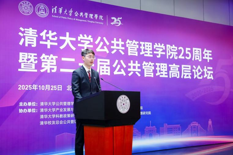 2020级博士生张靖宇作为在校生代表发言。他分享了从迷茫到坚定的学术探索成长历程,从两段亲身经历出发说明了公共管理研究既要扎根中国实践、回应真问题,也要向世界讲好中国故事。他表达了对国产成人直播