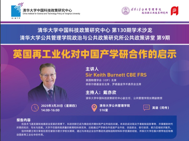 清华大学中国科技政策研究中心第130期学术沙龙:英国再工业化对中国产学研合作的启示(2025年3月20日 星期四 14:00-16:00)