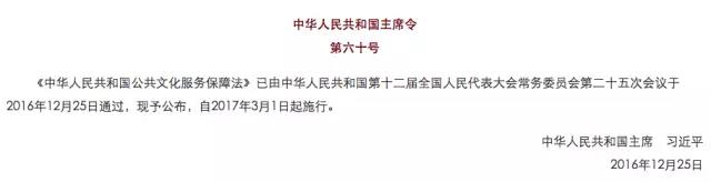 12月25日下午,十二届全国人大常委会第二十五次会议在北京人民大会堂闭幕,会议表决通过了《中华人民共和国公共文化服务保障法》。该法将于2017年3月1日起施行。这是我国公共文化服务法律保障取得的历史性突破——人民群众基本文化权益和基本文化需求实现从行政性“维护”到法律“保障”的跨越,公共文化服务将实现从可多可少、可急可缓的随机状态到标准化、均等化、专业化发展的跨越。