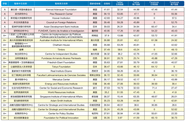 基于全球智库行为的两类数据集,我们构建了包括全球智库Twitter账户影响力、全球智库Twitter引用影响力、全球智库Facebook账户影响力和全球智库Facebook引用影响力的四个一级指标和若干个二级指标在内的“全球智库大数据指数”(Global Think Tank Big-Data Index,GTTBI)。最终,我们对全球智库Twitter账户影响力、全球智库Twitter引用影响力、全球智库Facebook账户影响力、全球智库Facebook引用影响力和全球智库大数据影响力等五个维度进行了评价与评级。