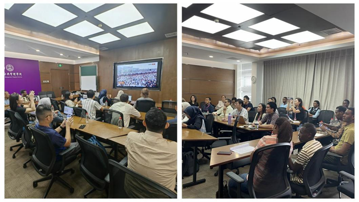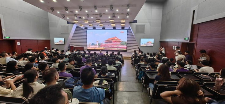 党委书记彭宗超、院长朱旭峰等班子成员及师生员工近200人在报告厅及分会场620会议室集体观看大会直播,近40名留学生在510会议室观看英文直播,40名学生在学校集体观看大会实况。