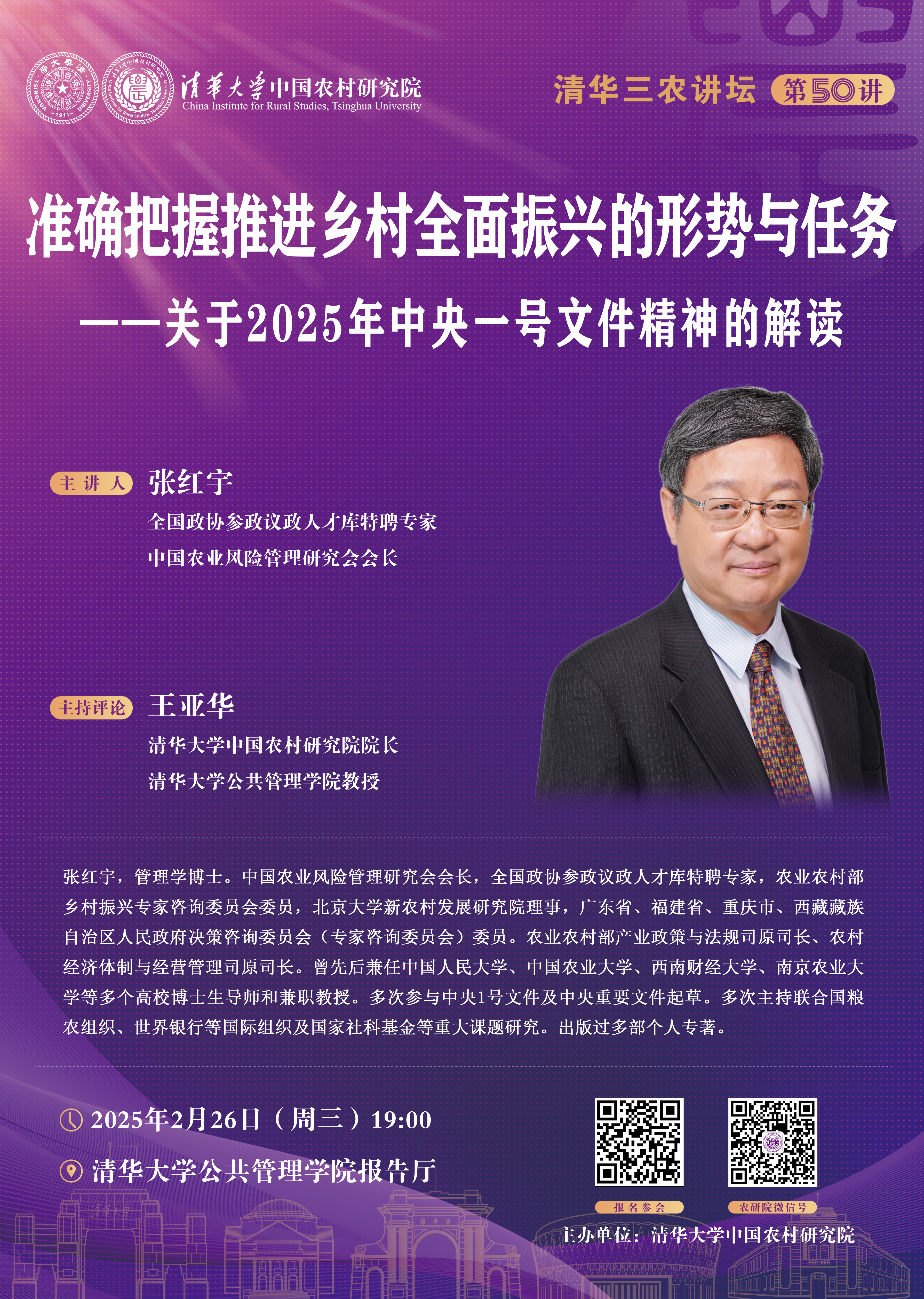 “清华三农讲坛”第五十讲:准确把握推进乡村全面振兴的形势与任务——关于2025年中央一号文件精神的解读(2025年2月26日 星期三 19:00)