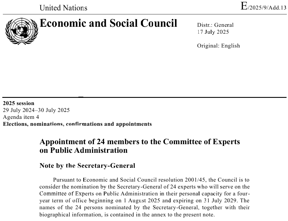 2025年7月30日,联合国经济及社会理事会正式通过了联合国秘书长对24位公共行政专家委员会(CEPA)的专家提名。清华大学文科资深教授、苏世民书院院长,清华大学人工智能国际治理研究院院长、清华大学全球可持续发展研究院院长薛澜作为该24位荣获提名的专家成员之一,将以个人身份连任联合国公共行政专家委员会委员,任期四年,从 2025 年 8 月 1 日起至 2029年 7 月 31 日止。此前,薛澜教授已于 2021年7月22日被联合国委任为公共行政专家委员会委员。