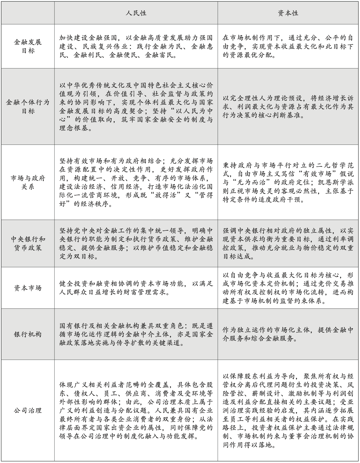 特殊性层面。第二次世界大战后,全球化浪潮推动世界各国金融行业的发展呈现诸多共性特征。然而,忽视各国迥异的发展背景与资源禀赋,将同质化的发展路径照搬套用,往往会产生不同的实践结果。其中,拉美国家金融业从快速兴起转向长期停滞倒退的教训,为其他后发国家敲响警钟。以资本性为特征的西方现代金融知识体系,与我国坚持人民性原则的金融知识体系存在本质差别(见表1)。从行为目标角度看,在个人主义盛行的西方资本主义国家,资本收益最大化是金融研究中个人利益的基本设定。在我国,始终强调集体利益与个人利益的和谐统一,而个人利益的界定和维护亦根植于中华优秀传统文化,强调“重信守诺”;“先义而后利者荣,先利而后义者辱”;“欲速则不达,见小利则大事不成”。中西方“金融”内涵的差异,是双方数千年迥异的历史文明演进与制度体系塑造的必然结果。西方金融发展依托商业文明与狩猎文明,具备鲜明的独立性特征,个人金融权在其社会历史演进中始终占据重要地位,步入资本主义阶段后,这一权利更超越神权、君权,成为社会发展坚守的信条。而中国金融的发展与之截然不同,农耕文明时期便孕育出共同体属性;尽管货币金融等基础要素在中西方均有悠久历史,但中国金融在很长一段时期内主要依附于政府体系,即便进入近代,私人金融业也主要与政府金融并行发展。