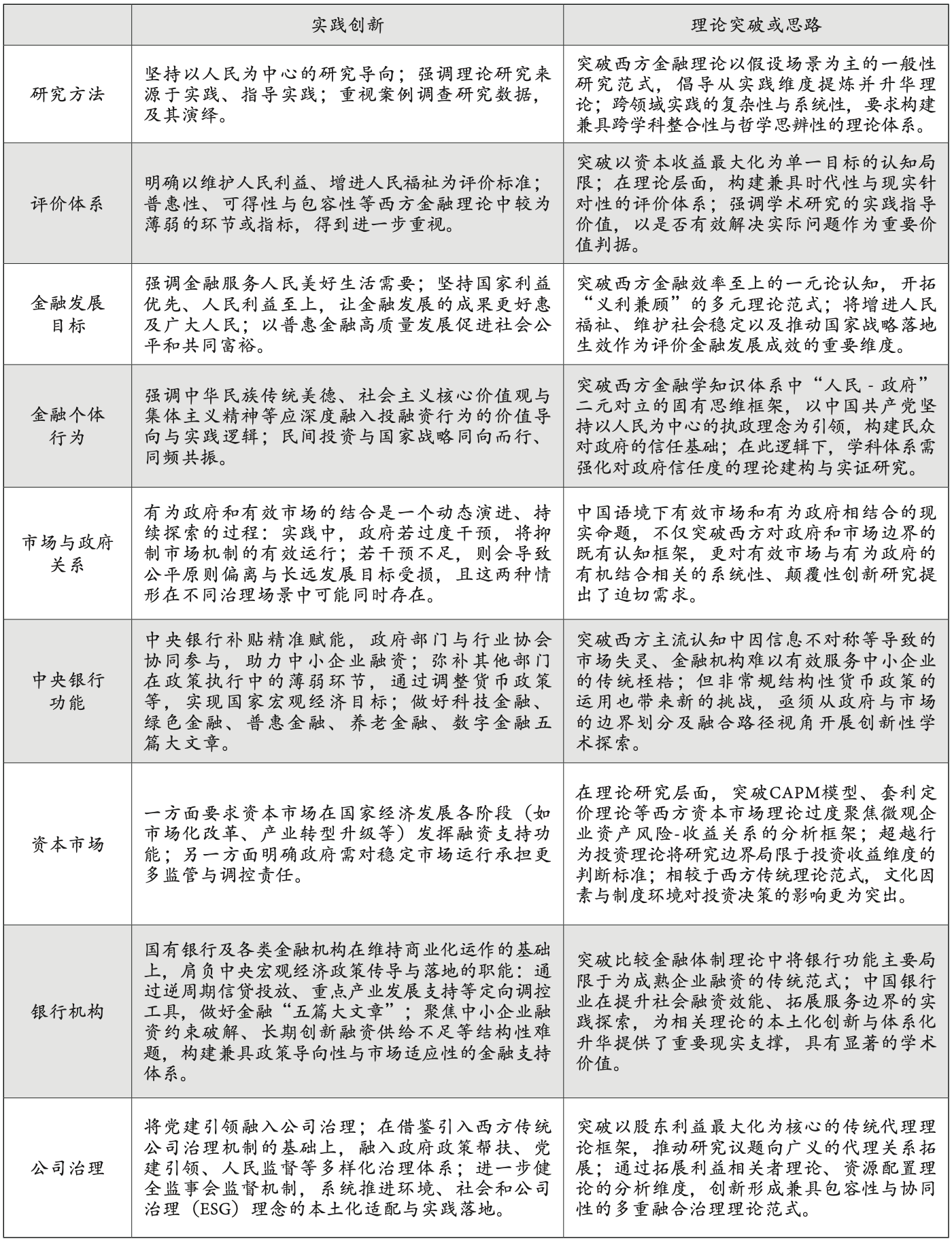 随着工业革命推动西方在经济、科技领域领先全球,“西方文明中心论”甚嚣尘上,一切不符合西方价值观的制度、思想和实践都被贴上“落后”的刻板标签。1949年后特别是改革开放以来,在党的领导下,我国银行体系重构、资本市场建立、金融对外开放、金融监管体制逐步完善,现代金融体系形成并不断发展,金融业总资产规模快速增加,金融市场快速发展并多次在外部金融危机冲击下保持稳定运行。这不仅有力地推翻了“落后说”,也进一步印证西方传统金融理论框架难以解释中国金融体系发展的成功。同时,我国金融实践创新、制度创新和理论突破不断取得丰硕成果(见表2),对现代金融知识体系的认知不断完善,但当前多数理论突破与创新仍处于雏形阶段,亟待开展系统、深入的学理研究。本文谨作抛砖引玉,梳理并探索中国金融发展理论突破的重要思路与学术贡献。中国金融学自主知识体系的构建与西方以“资本收益最大化”为准则的知识体系存在明显区分,以人民为中心的价值取向体现在原则、范畴、评价体系、分析方法等多个环节中。
