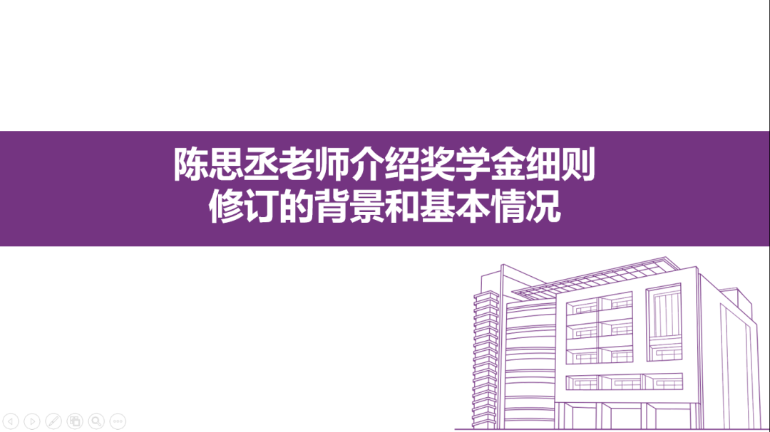 活动伊始,陈思丞老师向大家介绍了此次奖学金评定细则修订的背景。为贯彻落实清华大学2030高层次人才培养方案,持续完善高层次创新人才培养模式和研究生分类培养体系,全面推进教育评价改革,突出创新质量和贡献的评价导向,学校研工部于本学期下发通知,要求各院系进一步规范奖学金评定流程,修订奖学金评定细则,特别要求建立体育、美育、劳育的合理化评价机制,细化各项评定原则,探索建立劳动清单制度。