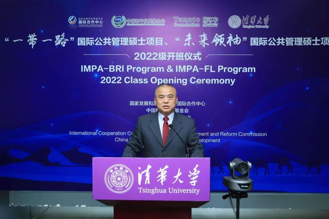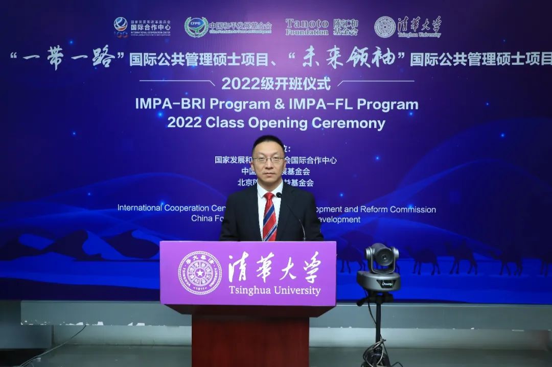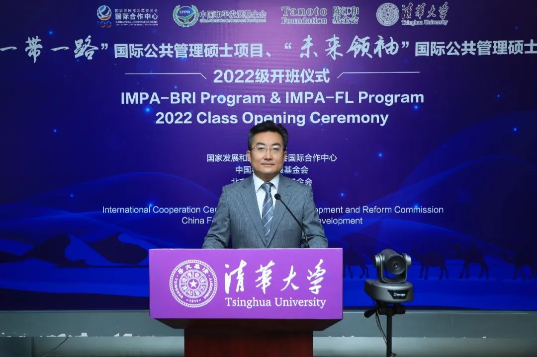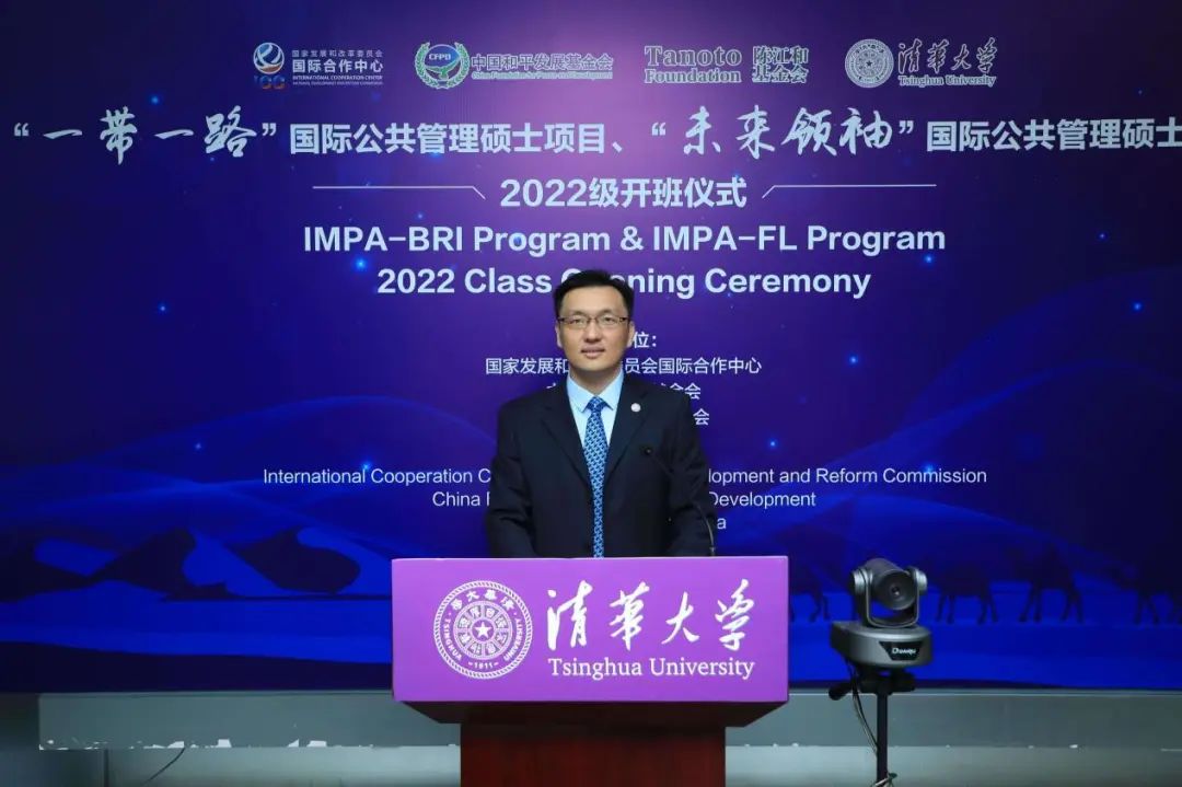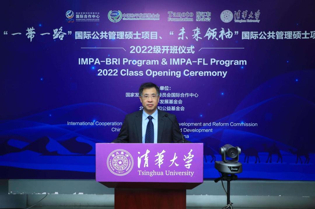 致辞。他首先向出席本次活动的各位嘉宾表示热烈欢迎,祝贺各位学员加入公管大家庭,并衷心感谢国家发展和改革委员会国际合作中心、中国和平发展基金会以及北京陈江和公益基金会对两个项目一如既往地支持。他指出,IMPA-BRI项目和IMPA-FL项目极具特色,一方面注重将公共管理学科的国际学术前沿成果与中国发展与治理经验的结合,另一方面注重学术理论与工作实践的协同培养,具有较高的战略意义。过去几年,两个项目均取得了不俗的成绩,很多学员毕业后都有了更好的发展,为推动中国与其母国的友好交流做出了重要贡献。与此同时,我们也应意识到,世界正在经历百年未有之大变局,这也对IMPA-BRI和IMPA-FL项目的发展以及学员的培养提出更高的要求。希望两个项目在主办单位的倾力支持和协助下,承续清华人和公管人的优良传统,继续强化学生学术能力的培养,拓展学生国际视野,助力学生更上一层楼。