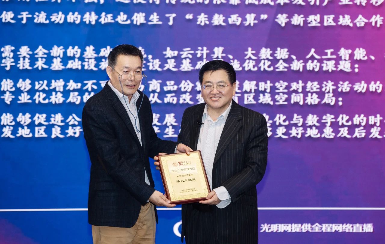 胡鞍钢教授向孙久文教授赠送清华大学“国情讲坛”纪念证书并合影留念