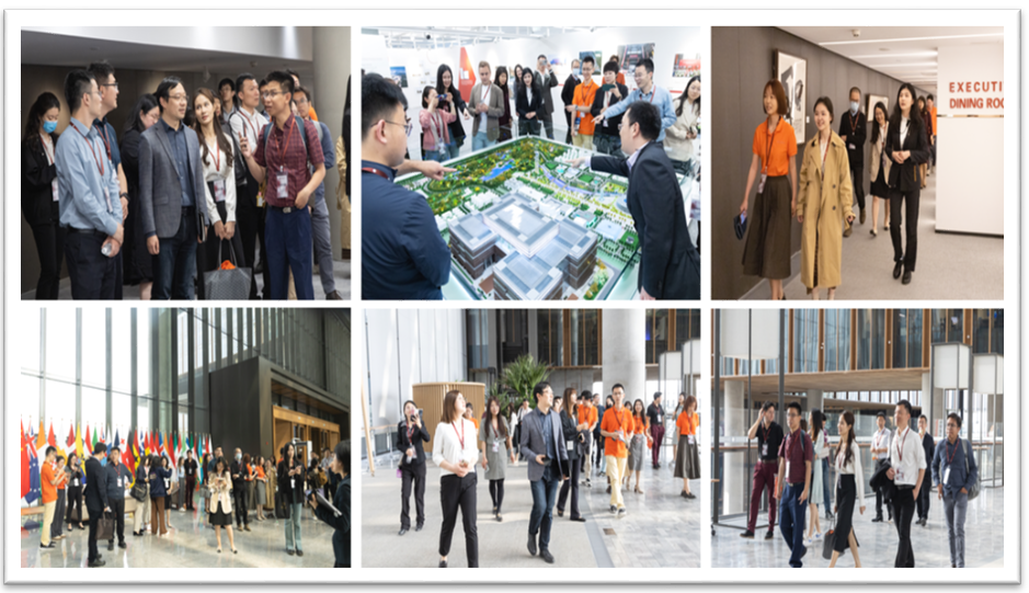 师生在亚投行工作人员的带领下参观了亚投行总部大楼,包括陈列馆、综合服务区、亚洲空中花园、大洋洲空中花园等,身临其境地感受了亚投行总部大楼的科技感和创新感。亚投行总部大楼的设计灵感源自“鲁班锁”,融合了中国传统的榫卯结构,彰显了其作为政府间多边发展机构的团结合作、互利共赢的精神;空中花园种植着来自各国的植物,文化长廊两侧装饰着各国艺术作品,展现了各国间交互包容、开放透明的合作理念。
