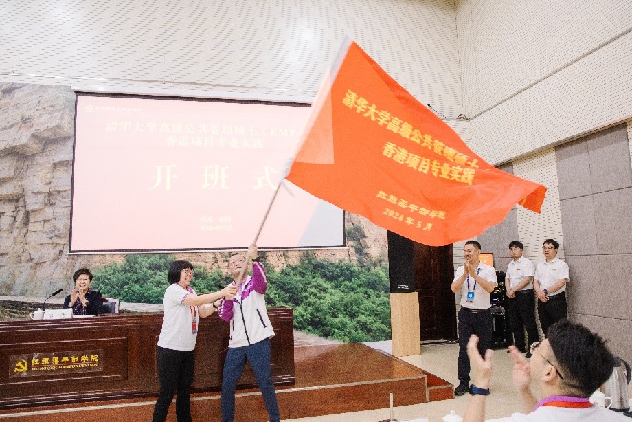 办公室副主任郭晓会主持仪式。王晨钟在开班仪式上授班旗,清华大学EMPA香港政务人才项目学生代表励娜、EMPA香港公共治理项目学生代表梁伟基共同接旗。